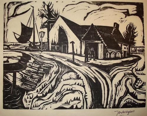 Later: We slippen sluizig door de waterdeuren. Weer veilig ingewaterd. Geen onaanlegbare plaatsen meer, maar stenen wallen of ingeglooide grassen. Het geoxideerde schip steigert uit de kade. Huisjes opgetrokken uit de verspleten bomen. Zonlicht, teruggeslagen uit de schaduw waar het was ingebet. Nogmaals het geruis van de bomen. …Er was een landweggetje, waar we over langs gingen met ingebouwde motoren, het water glinsterde op het dek.. Honderdtachtig graden gedraaid en rondgetold, maar slechts één gezicht onder de afgevlakte spiegel… Grote vogels met zwarte jassen observeren ons vanaf de waterkant. Weer wind. De vlagen overstromen onze schaduwen. Rode en/of groene boeien bepalen onze koers. Het dieselgeronk verstapelt zich onafgebroken in onze velden. Nog steeds geen horizon, maar lange bomenrijen in het licht.